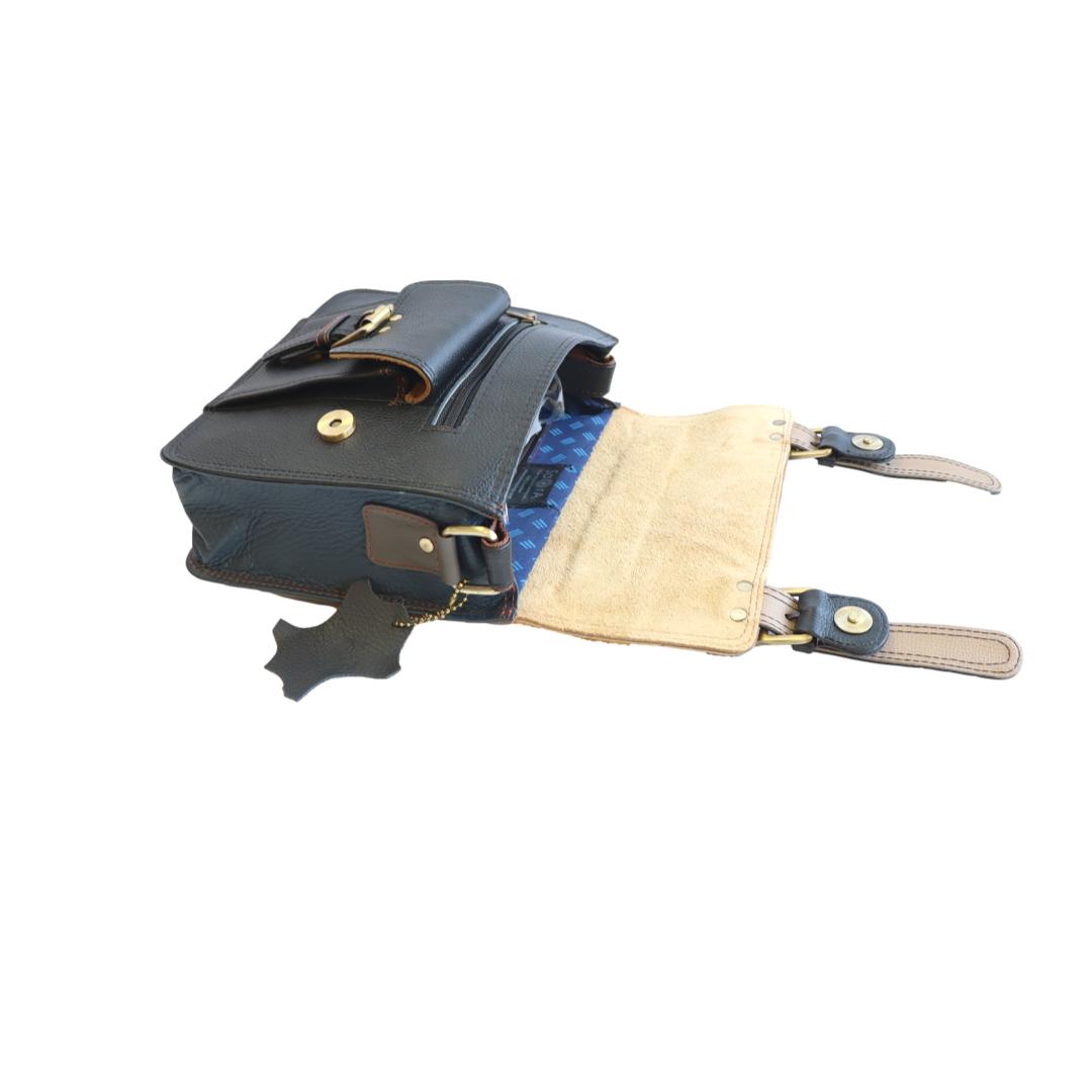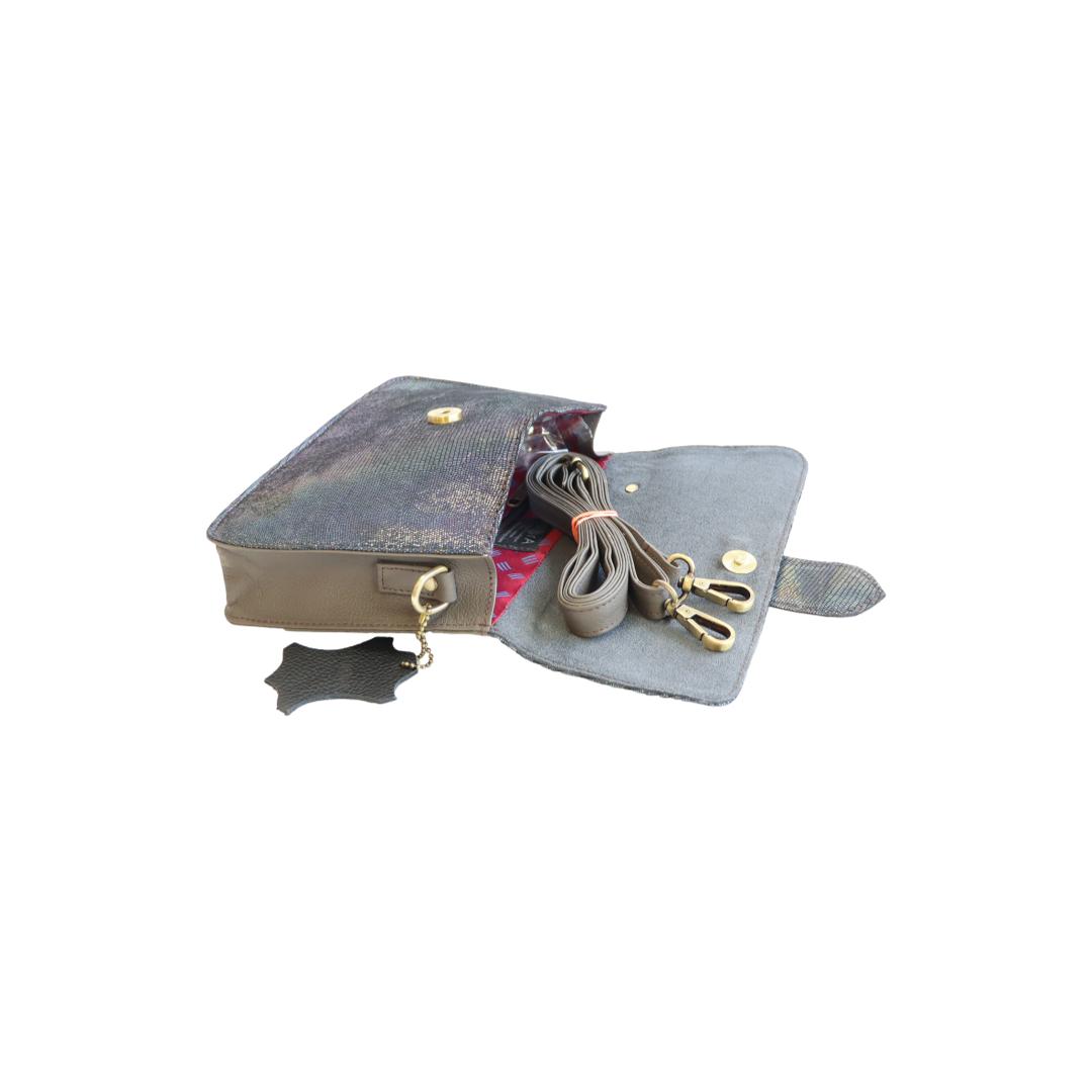 Caractéristiques : -Dimensions : 23 x 15 x 5 cm -Matière: Fabriqué artisanalement à partir de chutes de cuir recyclées -Fermeture : Pression -Intérieur : 1 grand compartiment, 1 pochette zippée -Extérieur : poignée et bandoulière
