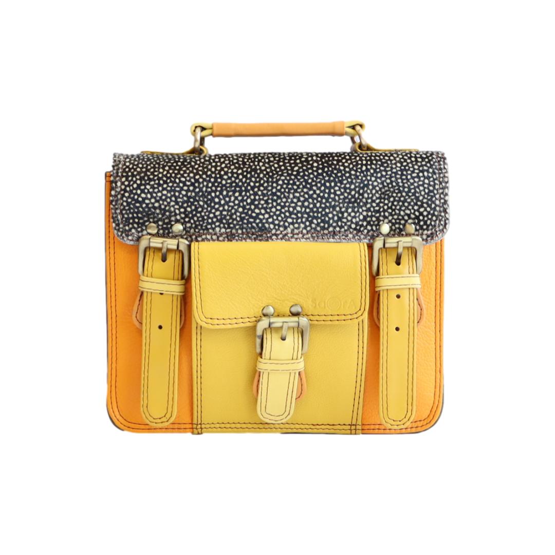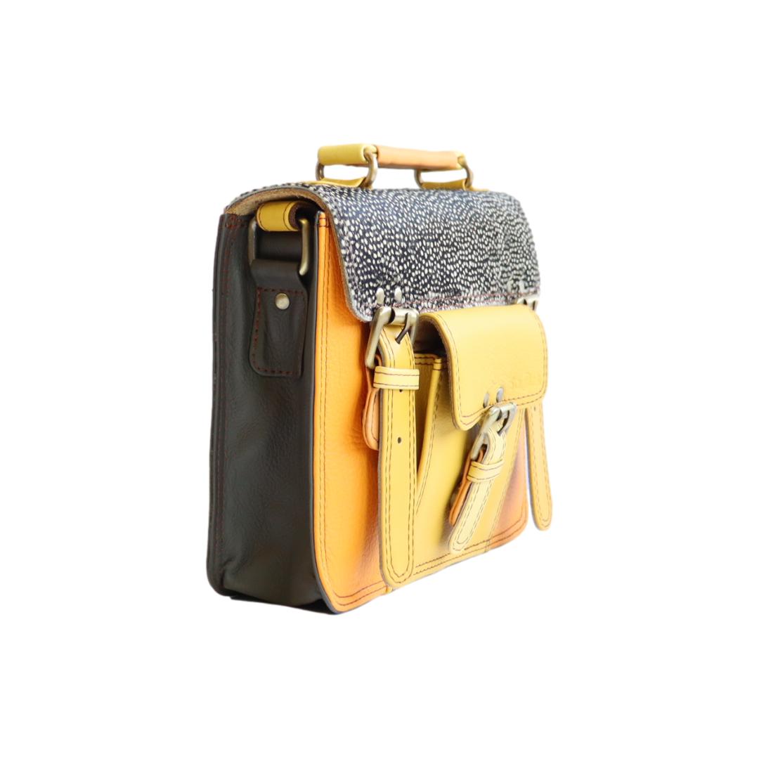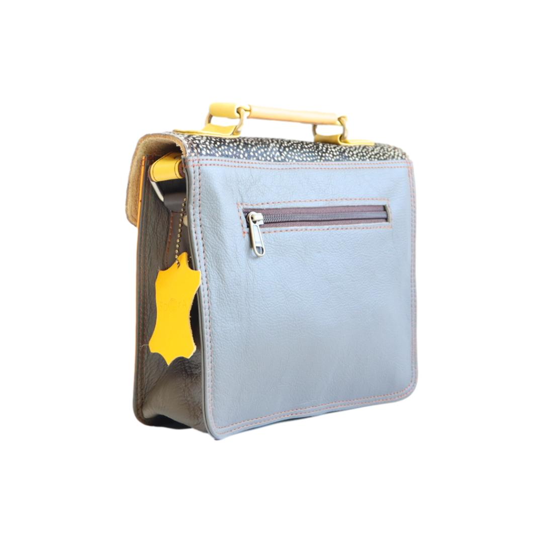 Découvrez le SANDRO FUNKI, un sac à main style cartable en cuir recyclé, magnifiquement confectionné à la main et unique par ses combinaisons de chutes de cuir. Parfait pour les citadines élégantes, il allie style, durabilité, et fonctionnalité avec une anse distinctive et une pochette avant, faisant de lui un choix éco-responsable et chic.