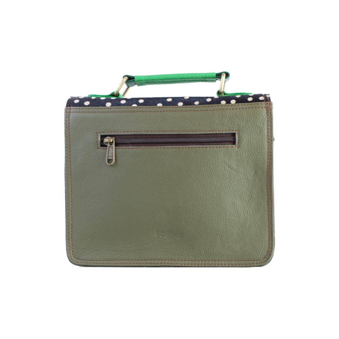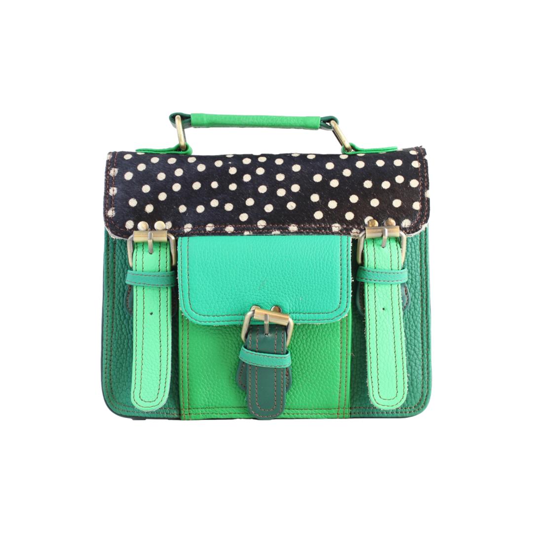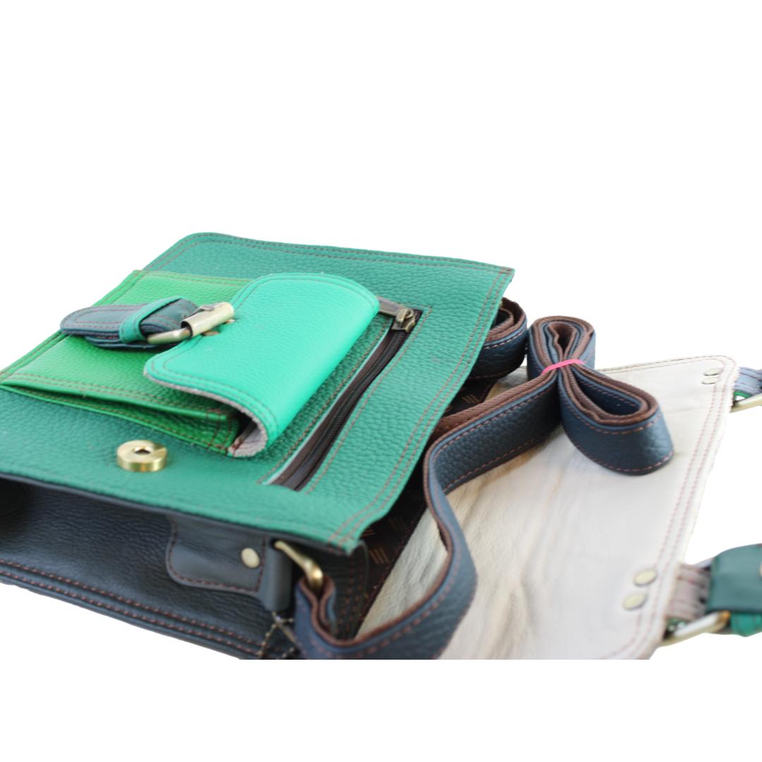 Découvrez le SANDRO FUNKI, un sac à main style cartable en cuir recyclé, magnifiquement confectionné à la main et unique par ses combinaisons de chutes de cuir. Parfait pour les citadines élégantes, il allie style, durabilité, et fonctionnalité avec une anse distinctive et une pochette avant, faisant de lui un choix éco-responsable et chic.