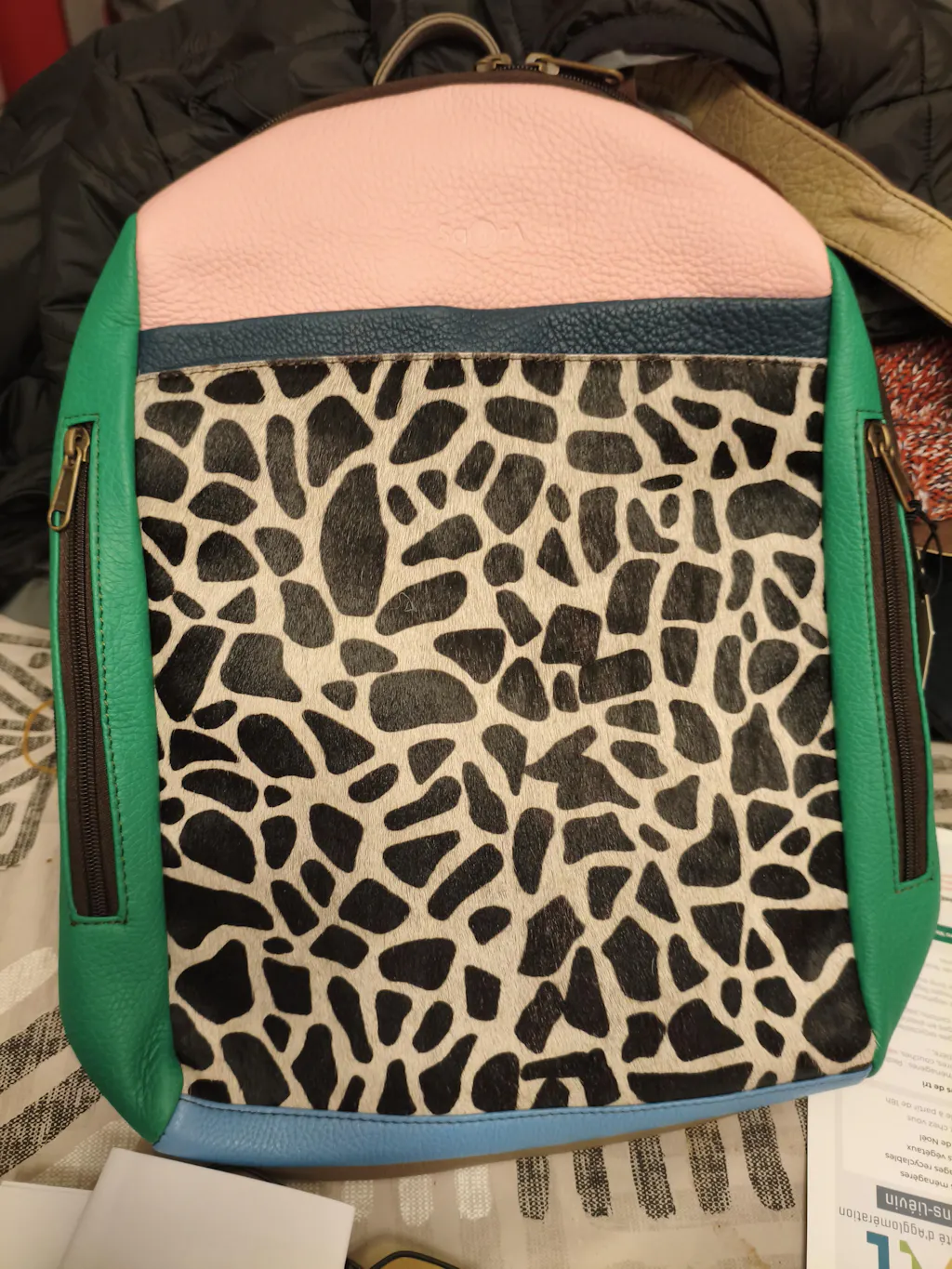 Très bel assortiment de cuirs et tissus. Je ne regrette absolument pas mon achat et en ferais d’autres si besoin. MAIS plusieurs détails négatifs méritent réflexion: qualité des mousquetons de la anse déplorables (il faut forcer pour les fermer et pas avec la tirette dévolue à cet effet mais directement sur les crochets, sinon restent en position ouverte ! Je doute fortement de leur longévité…), une tâche/un frottement indélébile sur le cuir avant (dommage à cet endroit mais peu voyant tout de même), des coloris trompeurs sur les photos (heureusement pour moi, bien plus jolis en vrai ! L’éclairage de la prise photo montrait du gris clair fadasse à l’arrière, j’ai eu un beau gris foncé/kaki et le cuir orange sur les côtés est devenu un joli terracotta rosé. Il n’y a aucun descriptif couleur alors il me semble que les photos doivent être le plus fidèle possible ou ajoutez-le dans le texte, svp !)